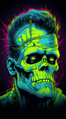 movie classic Frankenstein monster as a skeleton, 80s vapor wave illustration style, sharp & vivid neon colors, dark background, retro 80s punk band poster style, edgy, distressed, 8k --ar 9:16