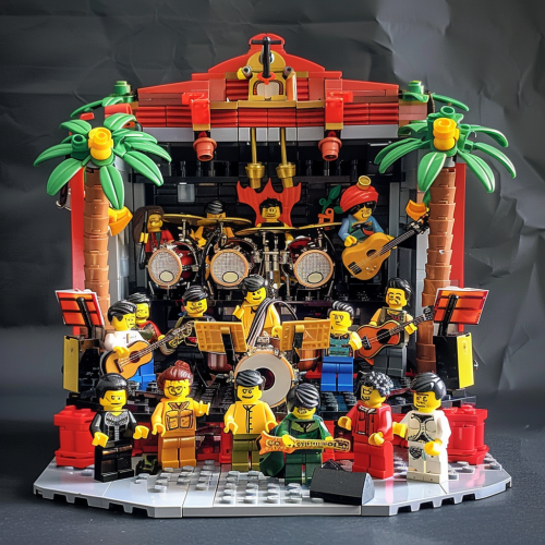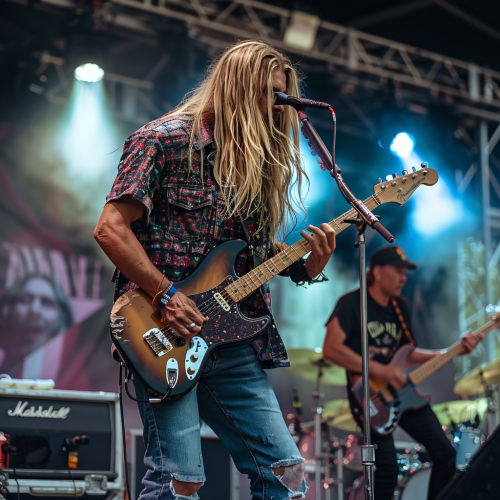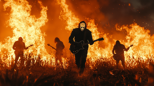 An entire rock band each member is wearing a Michael Meyers costume exactly like the one from the horror movie Halloween. Set up like they are playing a set in a field, entire background is flames from an engulfed cornfield on fire. Cinematic, visually stunning and horrific, 8k, Dynamic, ULTRAHD. --ar 16:9 --q 2 --v 6.1 --style raw --s 250