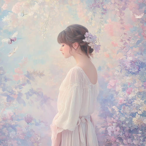 An album cover reflecting the theme of timidity and delicate beauty. Imagine a softly lit scene featuring a graceful lady in a vintage, pastel-colored dress, standing slightly turned away as if shy. She is surrounded by a dreamy, floral background with soft, muted colors like blush pink, lavender, and cream. Include subtle elements like delicate butterflies or gentle light rays to enhance the serene atmosphere. The title 'Timid Lady' should be elegantly scripted across the top or subtly incorporated into the floral design.