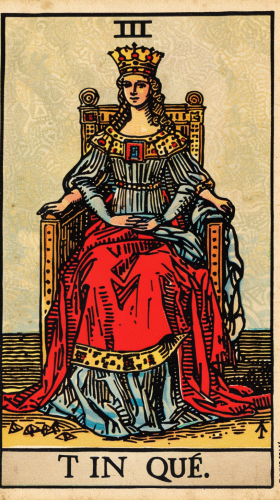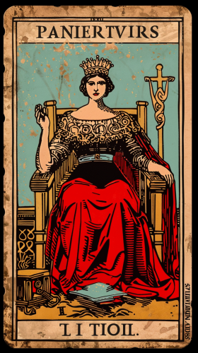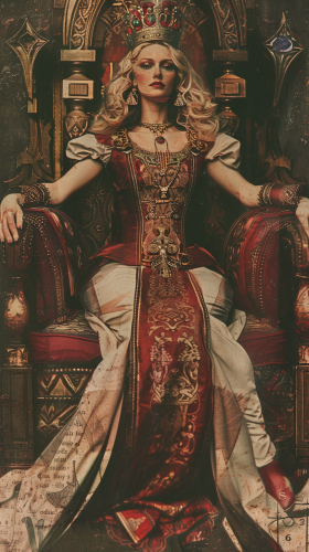 una carta del tarot vintage que representa a La Emperatriz, una señora mayor de edad con el pelo largo y blanco sentada en un trono, lleva una corona en la cabeza, un vestido rojo y una túnica azul, en la mano izquierda lleva un cetro con una cruz y en la mano derecha un escudo. Estilo arte collage, fotorrealismo fantástico. --ar 9:16 --v 6.0