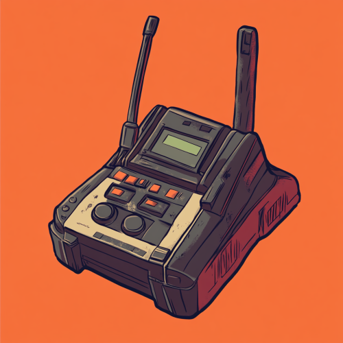 A bold, stylized illustration of a vintage walkie-talkie used on a film set, drawn in an American animation style with anime-inspired details. The walkie-talkie has classic buttons, an extended antenna, and rugged details that show it’s well-used. Thick, expressive lines and vibrant colors give it a dynamic, high-energy feel, with subtle shading and highlights that add depth without excessive detail. The design captures the essential look and functionality of camera crew equipment, blending Western animation flair with a hint of anime influence for a unique, cinematic vibe.