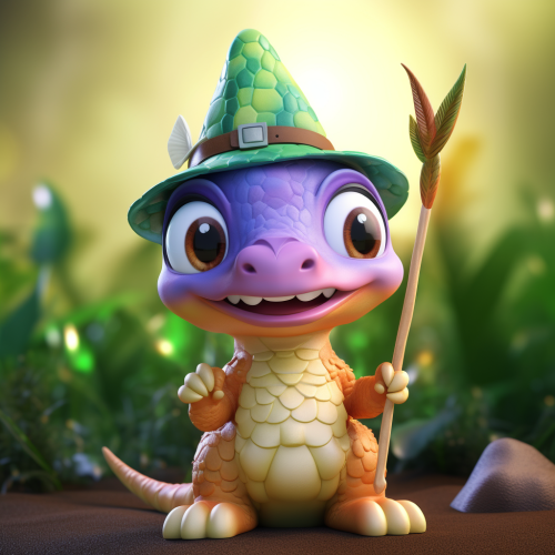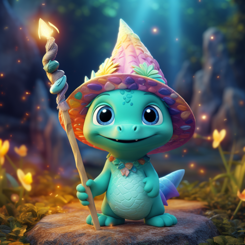Clay animation style, cute baby dinosaur with big eyes, wizard outfit, pointy hat, wand, spells, colorful dinosaur, cheerful smile, magical forest background, --v 5.2
