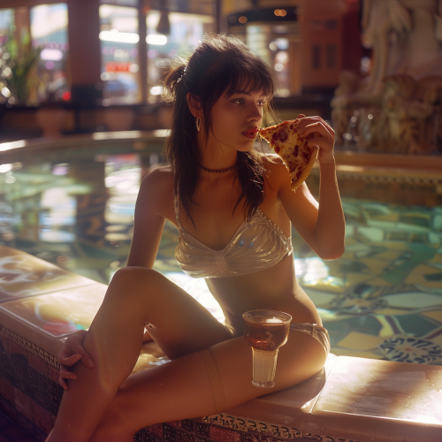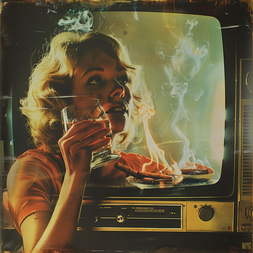 hyperrealism lady drinking scotch, ashtrays and cigars smoldering on a CRT TV screen, Polaroid flash photo 1980s, uncanny, confused lady, mid century, surrealism, bad art, nostalgic golden light --style raw