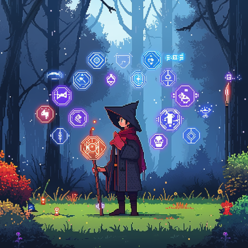 young wizard proficient in cryptocurrencies, standing at an angle against a mysterious forest background, short wand in hand glowing softly with a round light at the tip, several altcoins represented as pixel art floating around the forest without names, pixel style with a strong Japanese animation influence, the forest is lush and filled with magical mist and light, capturing a blend of ancient magic and modern tech, dynamic poses and expressive features, vibrant and engaging colors, --ar 1:1 --niji 5
