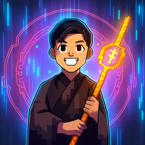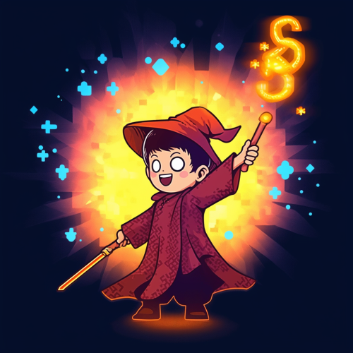 upper body portrait of a young wizard, with a wide, bright smile, holding a short wand with a glowing, sparkling light at the end, Bitcoin symbol in a pixelated background, pixel art style with strong Japanese animation influence, vibrant colors and a clear, cheerful expression, ideal for a 32x32 blog icon, the wizard's attire is simple with a magical flair, the Bitcoin symbol is prominent but subtly integrated into the background, --ar 1:1 --niji 5