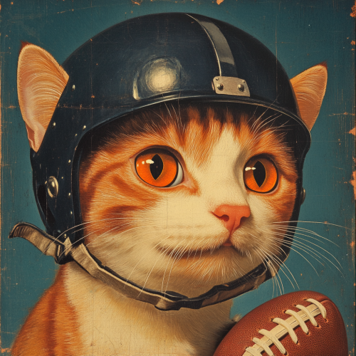 a 1940s vintage valentines style image of an orange and white tabby. The cat has orange eyes. The cat is wearing a navy football helmet. The cat has a small football. Cute