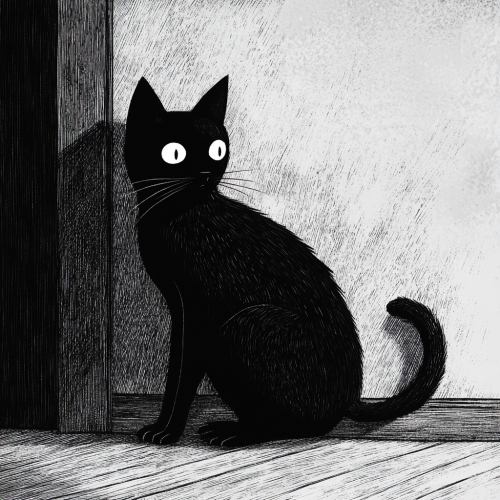 Low resolution screengrab of 1950's Super panavision 70 movie. Retro in colour. Photo-realistic close-up image of a black cat with yellow eyes. Wearing a hooded cloak and holding a sword. The setting is a dark, ominous forest filled with twisted, gnarled trees. Red sky. Lightning --ar 1:1