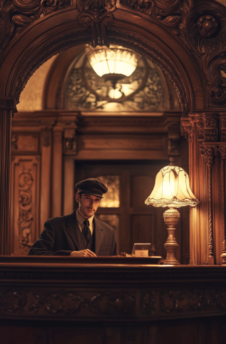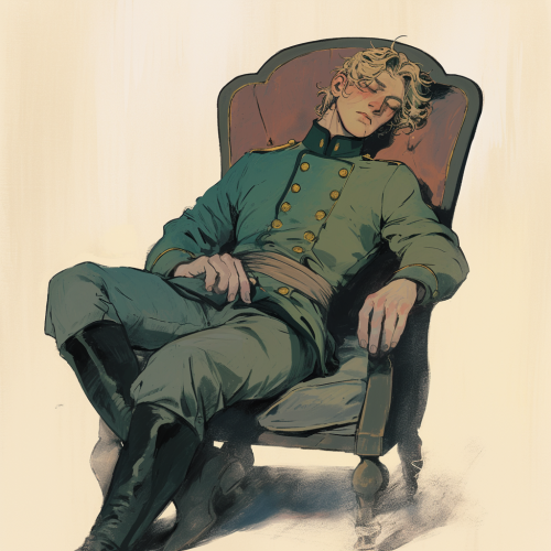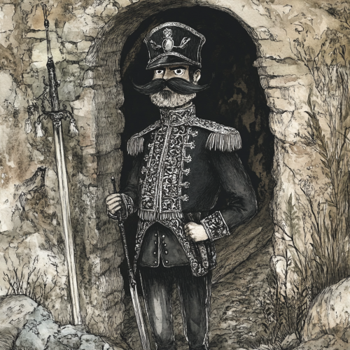 vintage storybook fantasy illustration, slightly whimsical but detailed line-art pen and ink, filled in with watercolors. A thin, severe man with a large mustache, in a black hussar uniform decorated with silver brocade. He holds a saber and stands, proudly and snootily, at the entrance to a mineshaft.