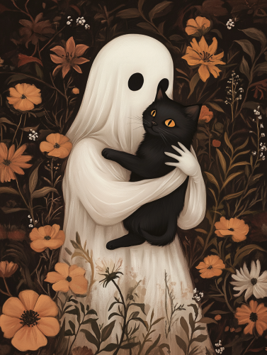 A cute ghost holding a black cat, with simple facial expressions and lines, surrounded by autumn flowers, creates an atmosphere of mystery and fantasy. The whole scene was created using oil painting technique on canvas, in a dark academy style. It has a vintage style with floral patterns as background elements, in a vintage art style. --ar 3:4 --v 6.1