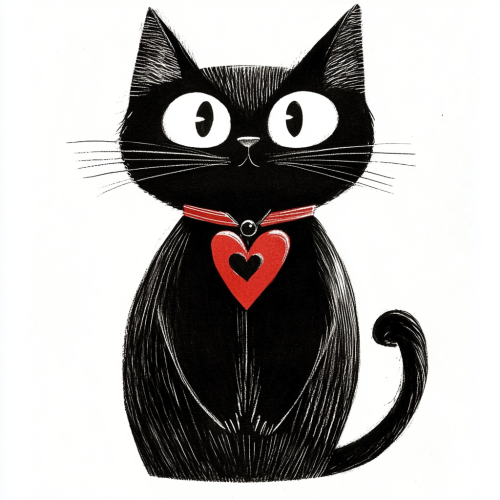 black and white cat in the style of vintage valentines cards. 1940s illustration. Cute. The cat is dressed like a vampire. Retro. Vintage. Hand drawn feel. Flat white background. E Rosen company style.