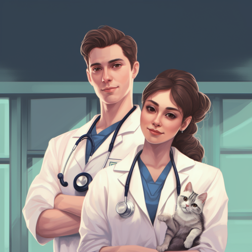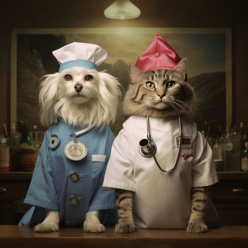 a doctor in uniform but with the face of a go and a nurse in uniform but with the face of a cat