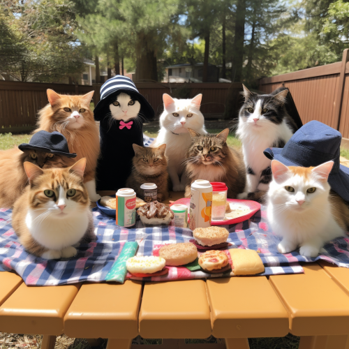 a group of 8 cat friends sitting at a picnic table of food, and they each look like one of the following: a male cat who resembles John Wick, red-headed male cat with a full beard, a male cat wearing a baseball cap with a full beard, a female cat wearing a bow in her hair and small pouty lips, a half-asian female cat with glasses, a half-asian female cat reading a book who has an apple in front of her on the table, a female cat wearing a police uniform, and a male cat in gym shorts who is laying down on the ground with his legs crossed, style of a children's book illustration