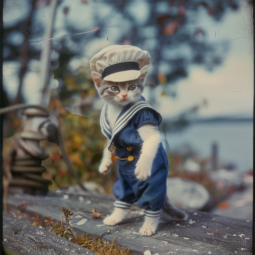 kitten wearing sailors outfit, old 35mm photo, 1930s colorized photography --v 6.0