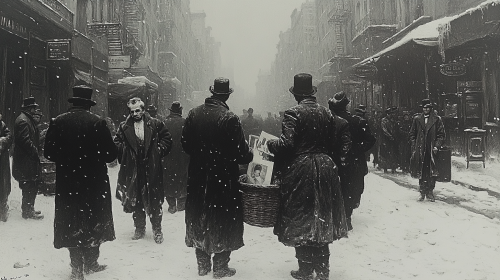 winter 1905 on Mulberry streeet, Little Italy, many poor people walking around a poor street vendor trying to sell images from a little basket to the people passing, ink, charcoal, in the style of Enki Bilal --ar 16:9 --s 750