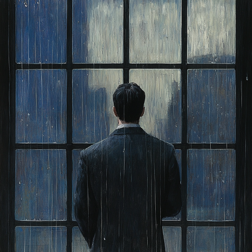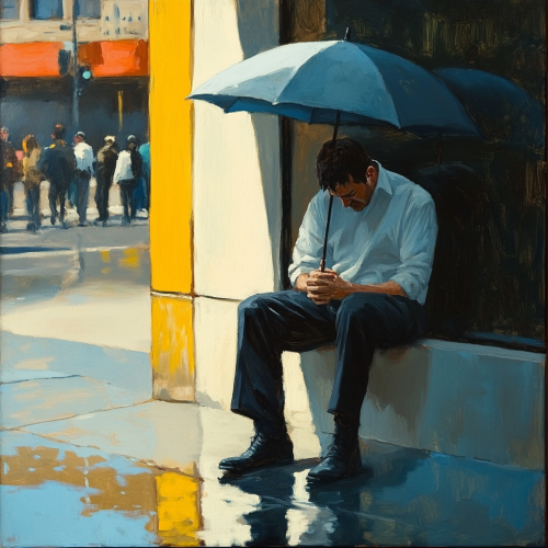 a man who always sees the glass half full. A man who enjoys wallowing in self pity no matter how much good fortune he has. Even on a sunny day with a bright beautiful sky he would rather huddle under an umbrella in pouring rain. Style of Edward Hopper oil painting showing loneliness and isolation in an urban setting even though many other people are around