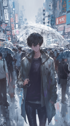 A picture using a more structured and bold watercolor style. A young man with short black hair and a grey coat standing under an umbrella in a crowded street on a rainy day. His eyes are full of longing as he gazes into the distance, surrounded by blurred figures rushing past him. --ar 9:16 --niji 6