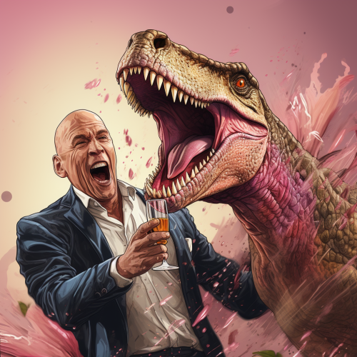 a bald head man is drinking champagne while he stroking the head of a tyrannosaurus rex dinosaur --style raw --s 250