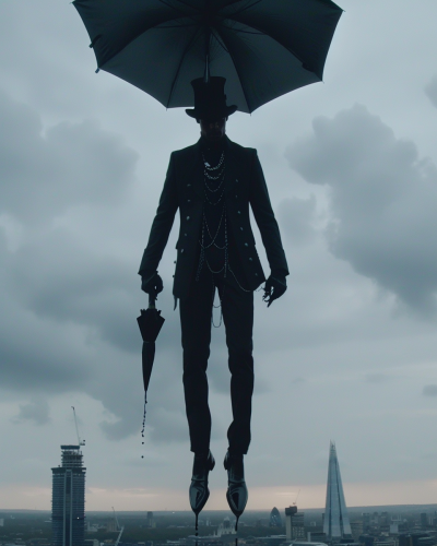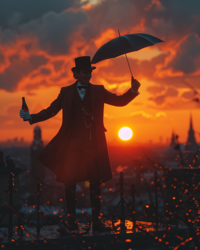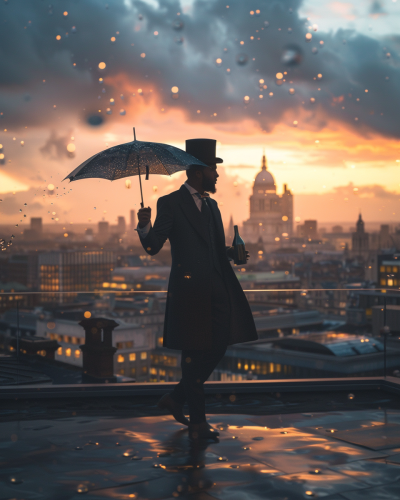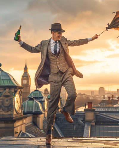 Cinematic of a dandy man in the 1910’s wearing a suit and an umbrella. He brings a bottle of champagne for the party, dancing on the roof over the london's skyline, classy, fashion campaign, sunset after rain, high detailed and realistic, 4k, taken with Canon eos r3, 35 mm, f/1.8 --ar 4:5 --v 6.0