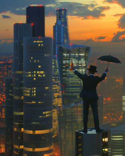 Dandy man dancing on the roof over the london's skyline, he holds an umbrella in one hand and a bottle of champagne in the other, fashion campaign, sunset after rain, high detailed and realistic, 4k, taken with Canon eos r3, 35 mm, f/1.8 --ar 4:5 --chaos 50 --v 6.0