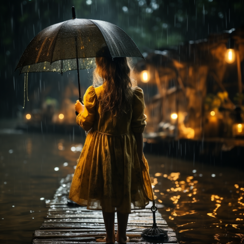 a girl holding colorful umbrella, in yellow dress, in cinematic pose, standing on a country boat, in rain, thunderstorm, cinematic lighting --s 750