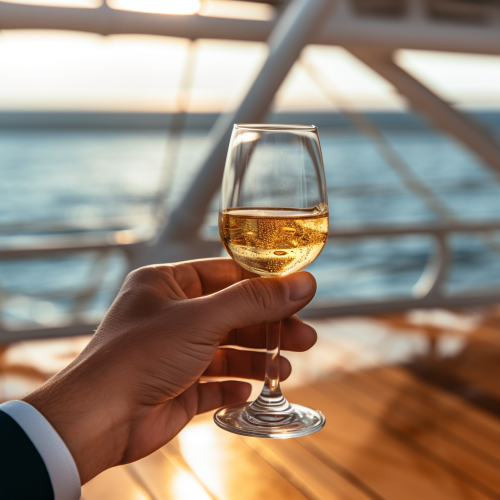 a close up shot of hand with golden ring holding a glass of champagne on the side of cruise deck facing the open ocean, cinematic shots, award winning shots