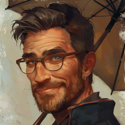 draw a man with an opened umbrella. the man has short dark brown hayr with a few whit strands of hair. also a goatee. the man wears brown glasses. he is looking to the umbrella witha happy face