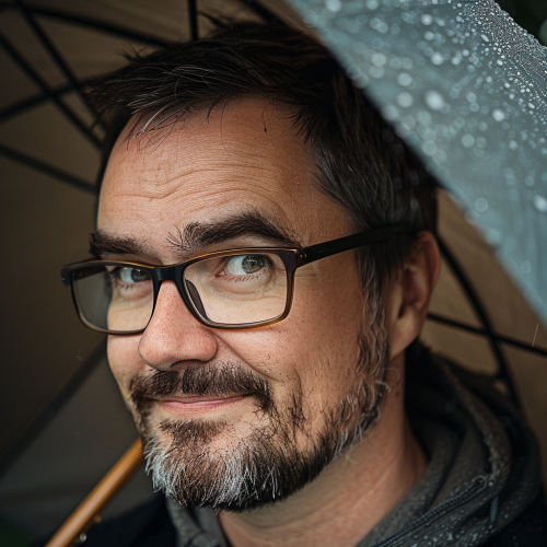 a photo of a man with an opened black umbrella. the man has short dark brown hair and goatee with a few white strands of hair. the man wears brown glasses. he is looking to the umbrella with a happy face