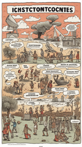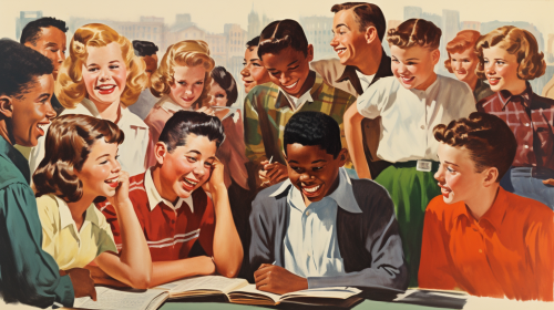 artwork form a 1950s kids adventure magazine depicting a multi-racial group of kids reading about Disruption as radical change which interrupts the status quo of an event, routine, or a community. Some disruptions are sudden while others are gradual; some disruptions are planned while others are spontaneous. Consequences of disruption can have both positive and negative effects, and are often perceived as both good and bad. These consequences have a wide range of significance both across time and scope of impact --ar 16:9