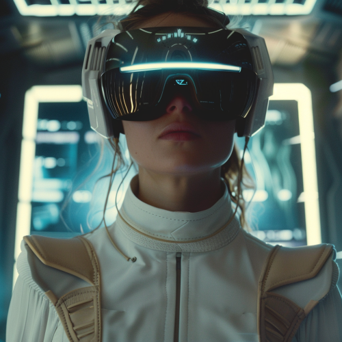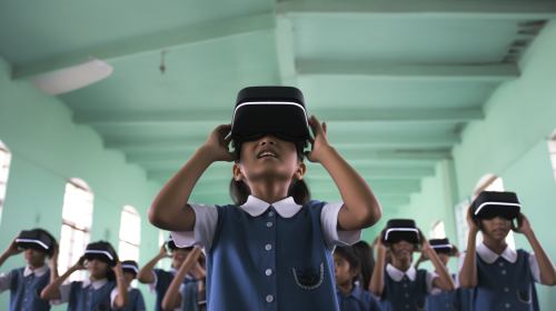 high angle of standing malaysian kids with vr in classroom --ar 16:9 --v 5.2