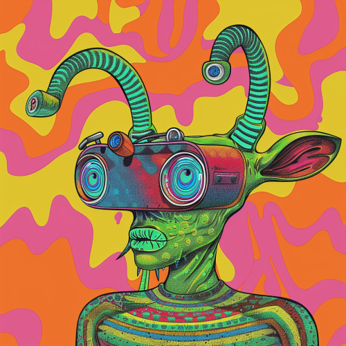 green earthworm character, with two short horns and one eye in the middle of face that wears a apple vision pro vr headset and clean skin, in the style of digital illustration pop-art fusion, applecore, ad posters, dot-painted colors, optical blending, unicorncore, 21st century --v 6.0