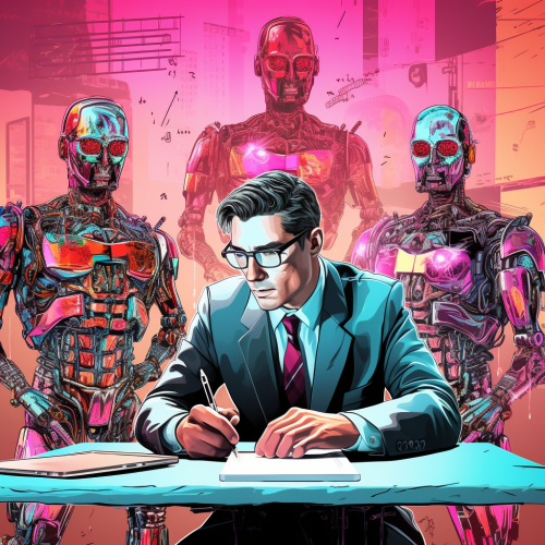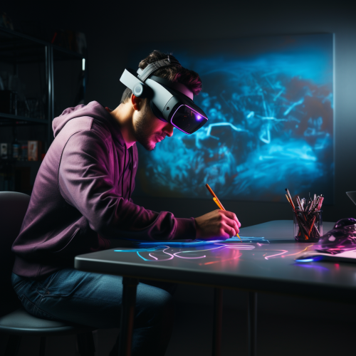 man with VR headset sits at desk and draws in the air with a digital pen. 100mm lens, photo studio