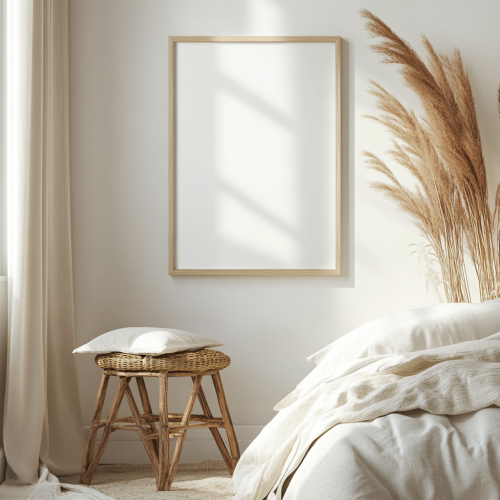 framed artwork, blank white A3 paper, vertical position, portrait orientation, hanging on wall of bedroom, close-up, small artwork size, bright studio space, mock up, front view, boho interior, bright space