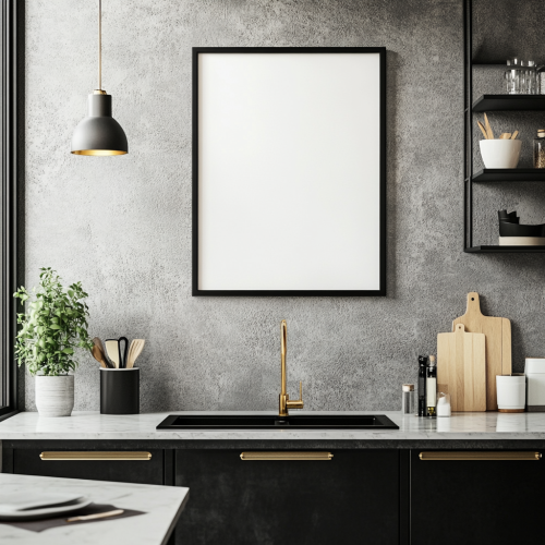 framed artwork, blank white A3 paper, vertical position, portrait orientation, hanging on wall of kitchen, bright studio space, mock up, front view, minialistic interior, bright space