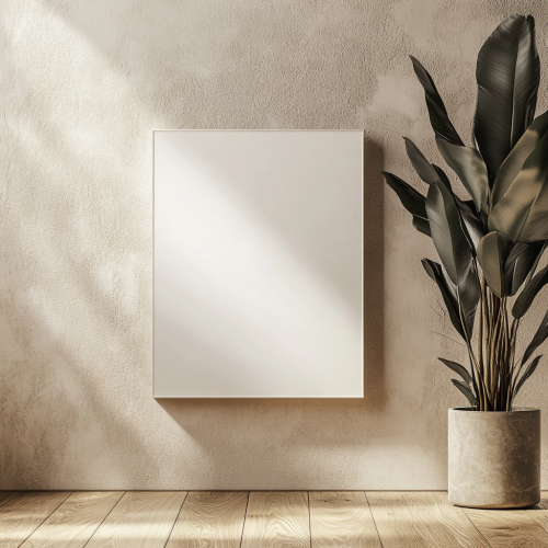 close up of A3 sized canvas artwork, plain white canvas, on plain cream wall, wooden floorboards, interioir styling, mock-up image, stock photohography