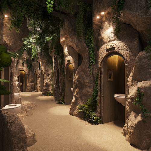 Imagine a photorealistic image of themed public toilets in a dinosaur-themed waterpark. The scene should capture the unique atmosphere created by ambient lighting and artificial rock formations. The enclosed toilet cubicles are designed to blend seamlessly with the prehistoric theme, featuring faux dinosaur bones and fossils embedded in the walls. Some cubicle doors are open, some closed. Lush artificial plants and vines drape over the rock structures, adding to the jungle-like ambiance. The lighting is soft and warm, casting gentle shadows that enhance the natural look of the surroundings. The floor is designed to resemble a sandy terrain, completing the immersive experience. Use a high-resolution camera with a 16:9 aspect ratio to capture this detailed and atmospheric scene. –ar 16:9 –v 5.2 –style raw –q 2 –s 750