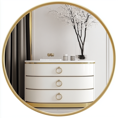 image of white chest of drawers for the living room. The image should have a circular golden frame around it. It must be a high-resolution image with no text or logo visible inside the circle --v 6.1