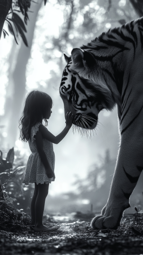 photo realistic:1.4, masterpiece, top quality, best quality, ultra detailed, absolutely resolution, 16k,highres, a monochrome photo of a young girl walking alongside a tiger in a misty forest, her hand lightly touching the tiger’s fur, as if they share an unspoken bond, produces images with information than 40 million pixels with cinematic-like detailed textures shot on a Sony SLR, monochrome, --ar 9:16