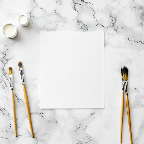 flat lay, top down view of white marlble desk, with plain white A4 sheet of paper in the center of scene, paintbrushes on side, mockup, stock photo, editorial, photoshoot