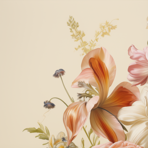 a small Jan Van Huysum painting of a couple of different kinds of flowers in different naturalistic colors. Behind them is a beige background. The flowers are photographically real as if photographed with a digital camera.