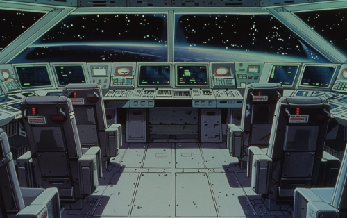 90's anime view from the bridge of a spaceship. empty seats for several crew members and computer terminals. the emptyness of space is striking. grainy vhs, 35mm --style raw --no planets --ar 8:5