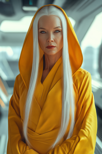 a photorealistic portrait of a mature woman from a futuristic Sci-Fi setting. She has orange skin, long white hair and pupilless white eyes. She wears a yellow robe with the hood pulled down and is standing on the bridge of her personal ship. --ar 2:3 --v 6.1