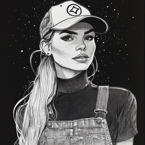 sketched portrait of an adult woman with long blonde tied back in a high ponytail, Jessica Knappett, wearing a baseball cap with a meteor symbol logo on it, long hooked nose, aged in her 30s, wearing a 90s dark pair of overalls and a roll neck inspired by the clothing from the Alien movie franchise, sci-fi, on a black background in the style of John Berkey illustrations, small dots of dull sci-fi light and stars in the background, dark space, black and white, --v 6.1
