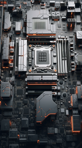 Hyper realistic illustration of a computer motherboard, inside a computer, from the future. Photo realism, cinematography, 4k --ar 9:16