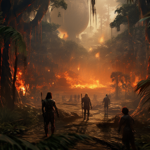 grand scale war betwen umans and elves. sci-fi setting. burning jungle.