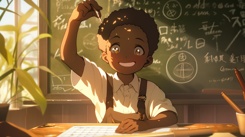 a medium shot of a 10-year-old African boy doing multiplication problems on the chalkboard in his classroom in Africa, he is smiling, high-definition, anime style, --ar 16:9 --niji 6