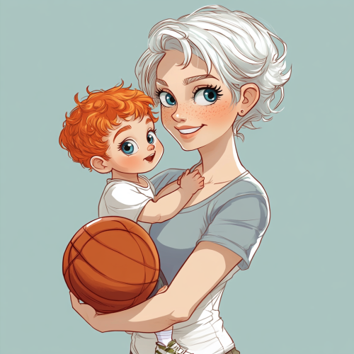 a cartoon of a mom who is 28 years old with a short pixie haircut that is silver in color holding her one year old boy chest to chest with big blue eyes and red hair. He also has basketball shorts and a t shirt on with socks on his feet