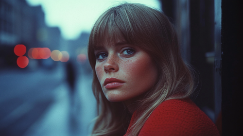 Close-up of a young Julie Christie in 1967 posing for a photographer looking a bit concerned and scared yet trying to be beautiful streets of London at dusk, vivid details,. 1960s styles, clothing and colors, dark stylish shadows and light --ar 16:9 --v 6.1 --style raw