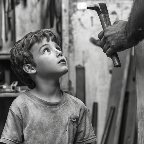 A black-and-white photo of a young boy looking up at a mentor, who is handing him a hammer. The scene is in a workshop with tools and wood around them. The atmosphere is serious but hopeful, with both mentor and boy focused on the task at hand.