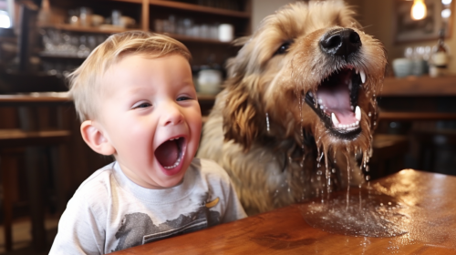 3-year-old boy slurps in high chair, drops some mash which dog enjoys licking it off high chair shelf. Mom surprises them as two friends in the tavern.... --ar 16:9