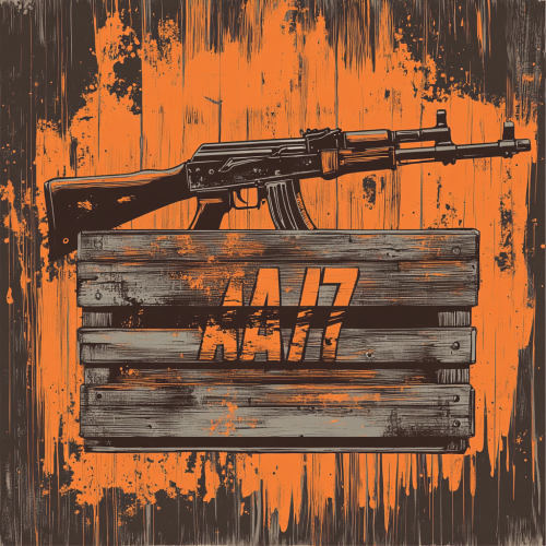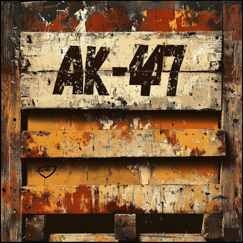 A gritty, artistic depiction of a wooden crate with the text 'AK-47' stenciled on it, inspired by a spray paint aesthetic. The text should be bold and impactful, with a rough, industrial look that includes textures mimicking aged wood and metal. The design should feature warm, rustic tones like browns, oranges, and blacks to enhance the crate's worn and weathered appearance. Spray paint splatters and drips around the text should add to the overall grunge feel. The composition should evoke a sense of ruggedness and durability, perfect for a striking visual impression.